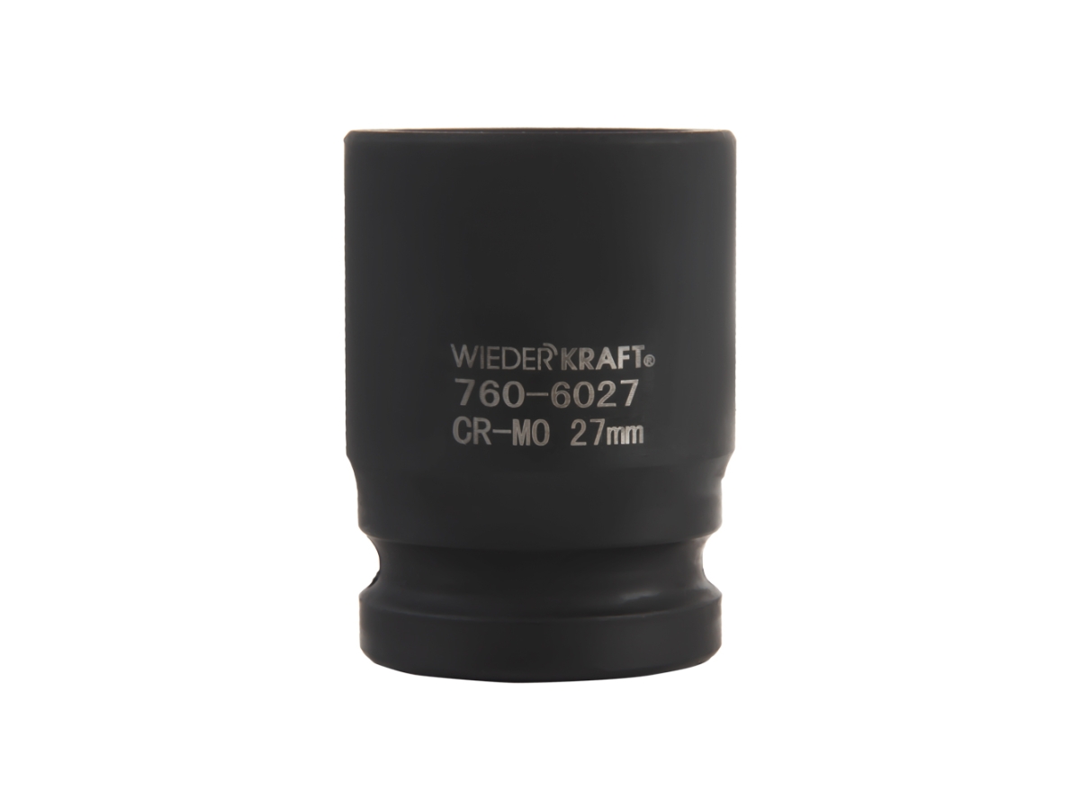 Ударная головка WiederKraft WDK-760-6027 (27 мм) с посадочным квадратом 3/4″ и 6-гранным рабочим профилем. Выполнена из высококачественной хром-молибденовой стали 42 CrMo. Включения хрома и молибдена делают изделие прочным, устойчивым к нагрузкам и деформациям.