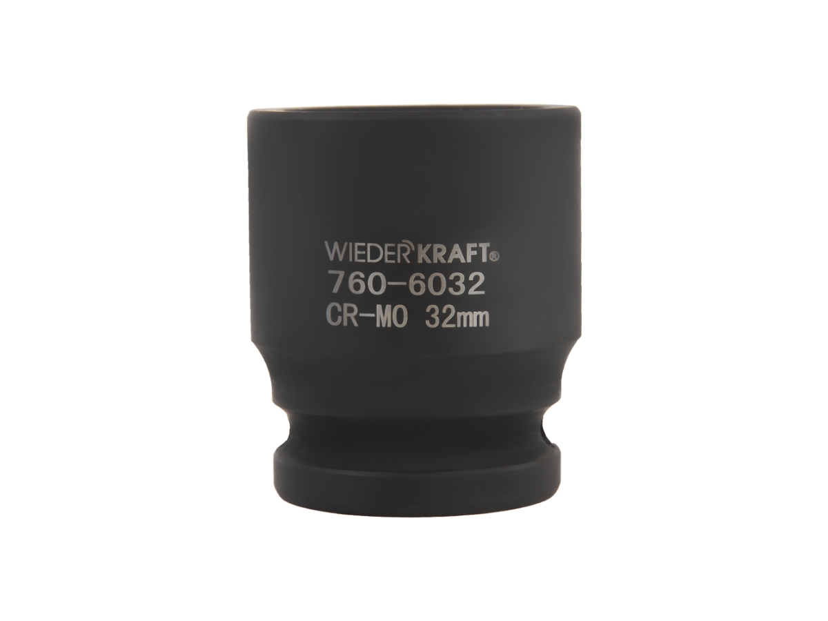 Ударная головка WiederKraft WDK-760-6032 (32 мм) с посадочным квадратом 3/4″ и 6-гранным рабочим профилем. Выполнена из высококачественной хром-молибденовой стали 42 CrMo. Включения хрома и молибдена делают изделие прочным, устойчивым к нагрузкам и деформациям.