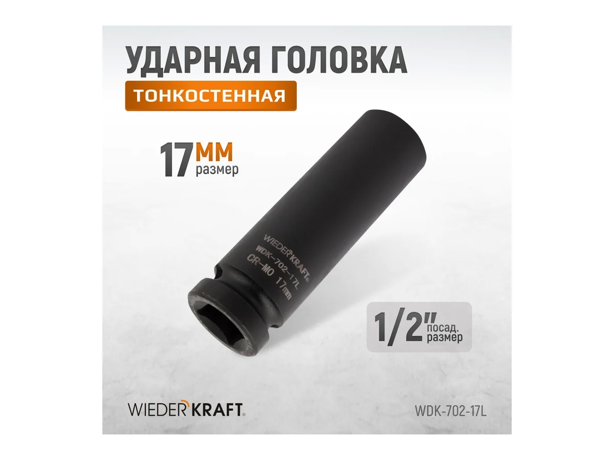 Тонкостенная глубокая ударная головка WiederKraft WDK-702-17L (17 мм) с посадочным квадратом 1/2? и 6-гранным рабочим профилем. Выполнена из высококачественной хром-молибденовой стали 42 CrMo. Включения хрома и молибдена делают изделие прочным, устойчивым к нагрузкам и деформациям.