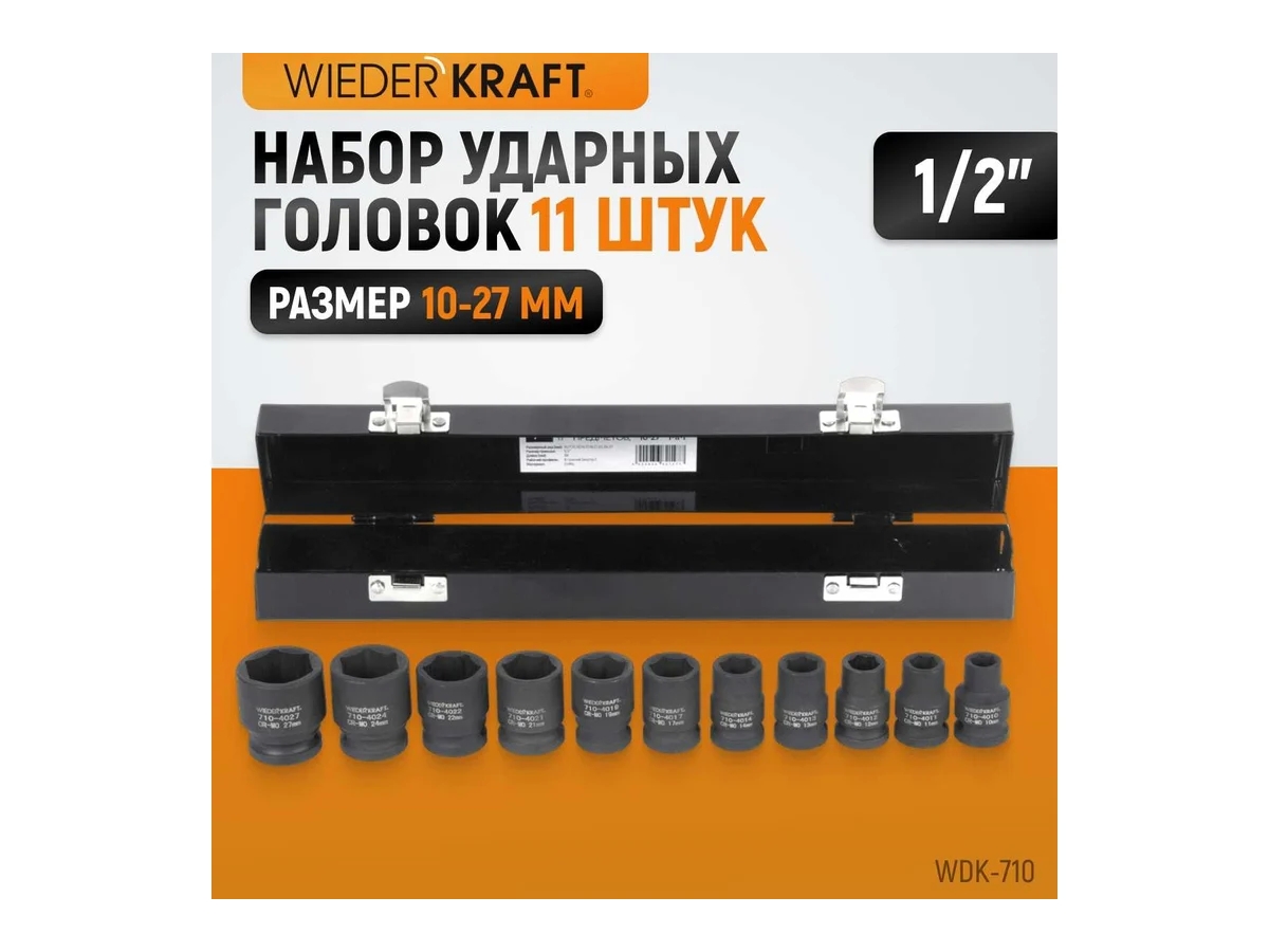 Набор ударных головок WiederKraft WDK-710 – профессиональный комплект для работы с резьбовыми соединениями с помощью ударного гайковерта. Включает 11 шестигранных головок (10–27 мм) с посадочным квадратом 1/2?, выполненных из прочной хром-молибденовой стали 42CrMo. Специальный профиль нагрузки вне угла предотвращает скругление граней крепежа, продлевая срок службы инструмента. Поставляется в металлическом кейсе с защелкой из нержавейки для удобного хранения и транспортировки.