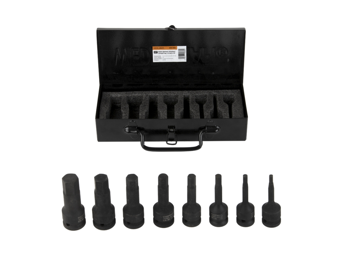 Набор ударных головок WiederKraft WDK-705H – профессиональный комплект для работы с крепежными элементами с использованием ударного гайковерта. Включает 8 шестигранных головок (5–19 мм) с посадочным квадратом 1/2″, выполненных из прочной хром-молибденовой стали 42CrMo. Высокая стойкость к ударным нагрузкам делает набор надежным инструментом для СТО, автомастерских и гаража. Поставляется в металлическом кейсе с защелкой из нержавейки для удобного хранения и транспортировки.