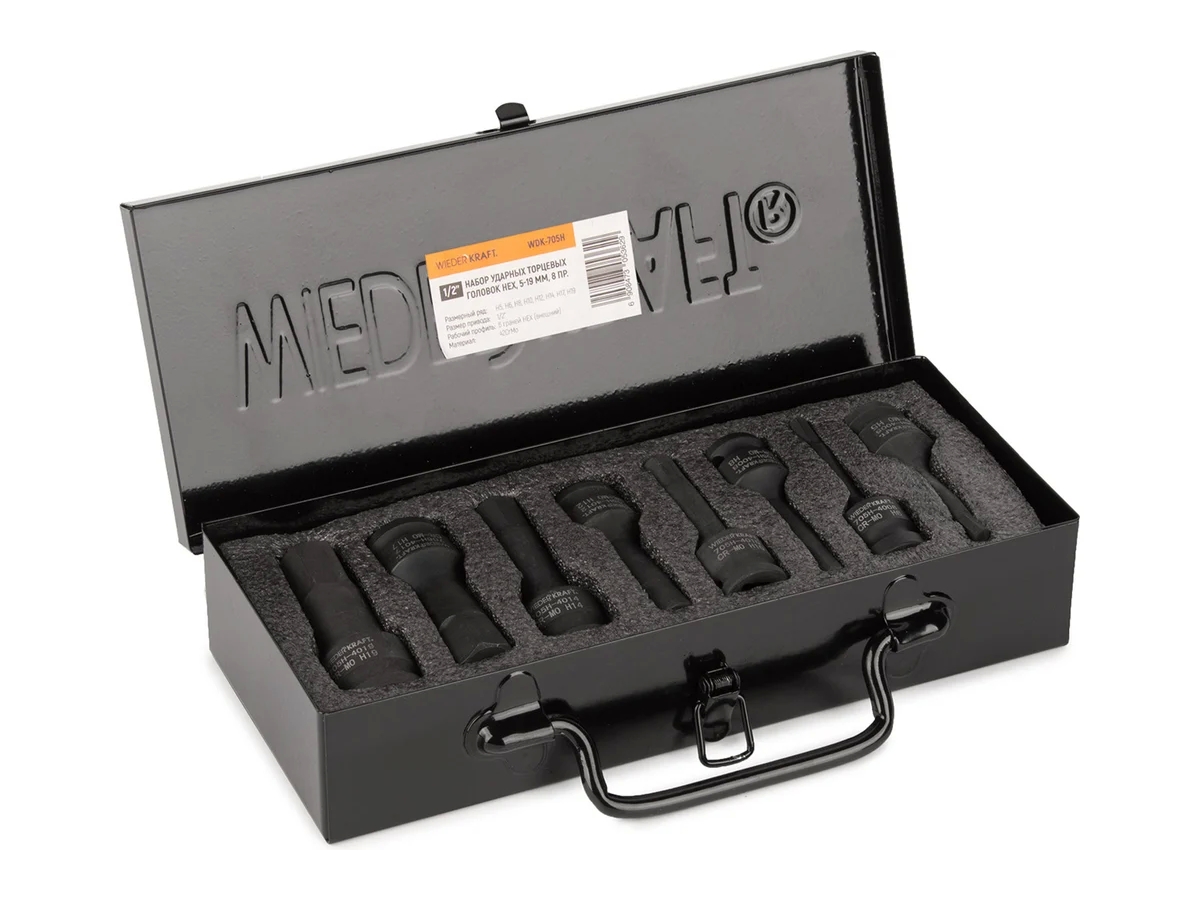Набор ударных головок WiederKraft WDK-705H – профессиональный комплект для работы с крепежными элементами с использованием ударного гайковерта. Включает 8 шестигранных головок (5–19 мм) с посадочным квадратом 1/2?, выполненных из прочной хром-молибденовой стали 42CrMo. Высокая стойкость к ударным нагрузкам делает набор надежным инструментом для СТО, автомастерских и гаража. Поставляется в металлическом кейсе с защелкой из нержавейки для удобного хранения и транспортировки.