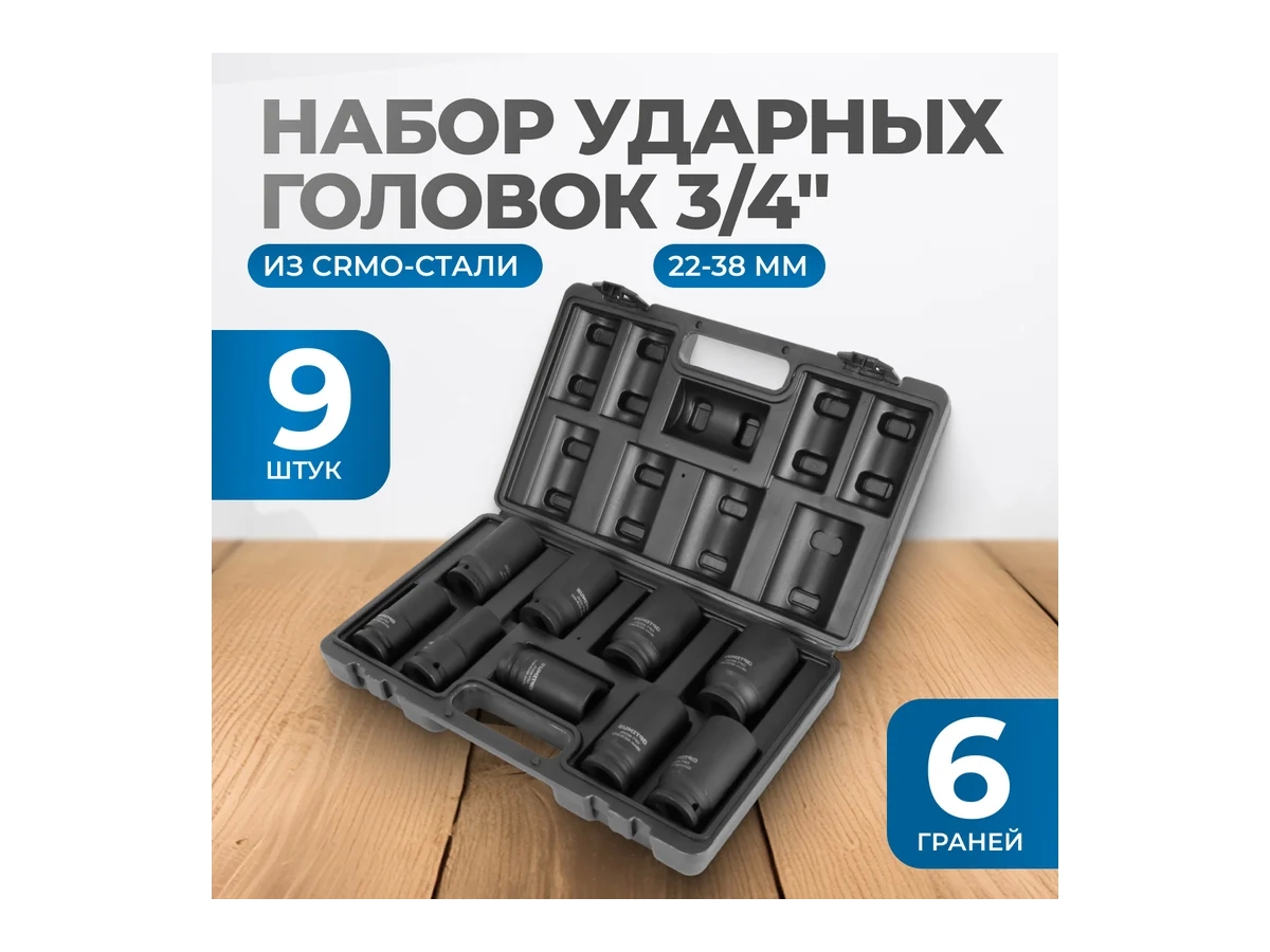 Набор ударных глубоких головок OPT-60209 3/4″ предназначен для работы с крепежом при помощи ударных гайковертов — пневматических или электрических. Головки выполнены из стали 42CrMo, что обеспечивает их прочность, устойчивость к динамическим нагрузкам и долговечность.