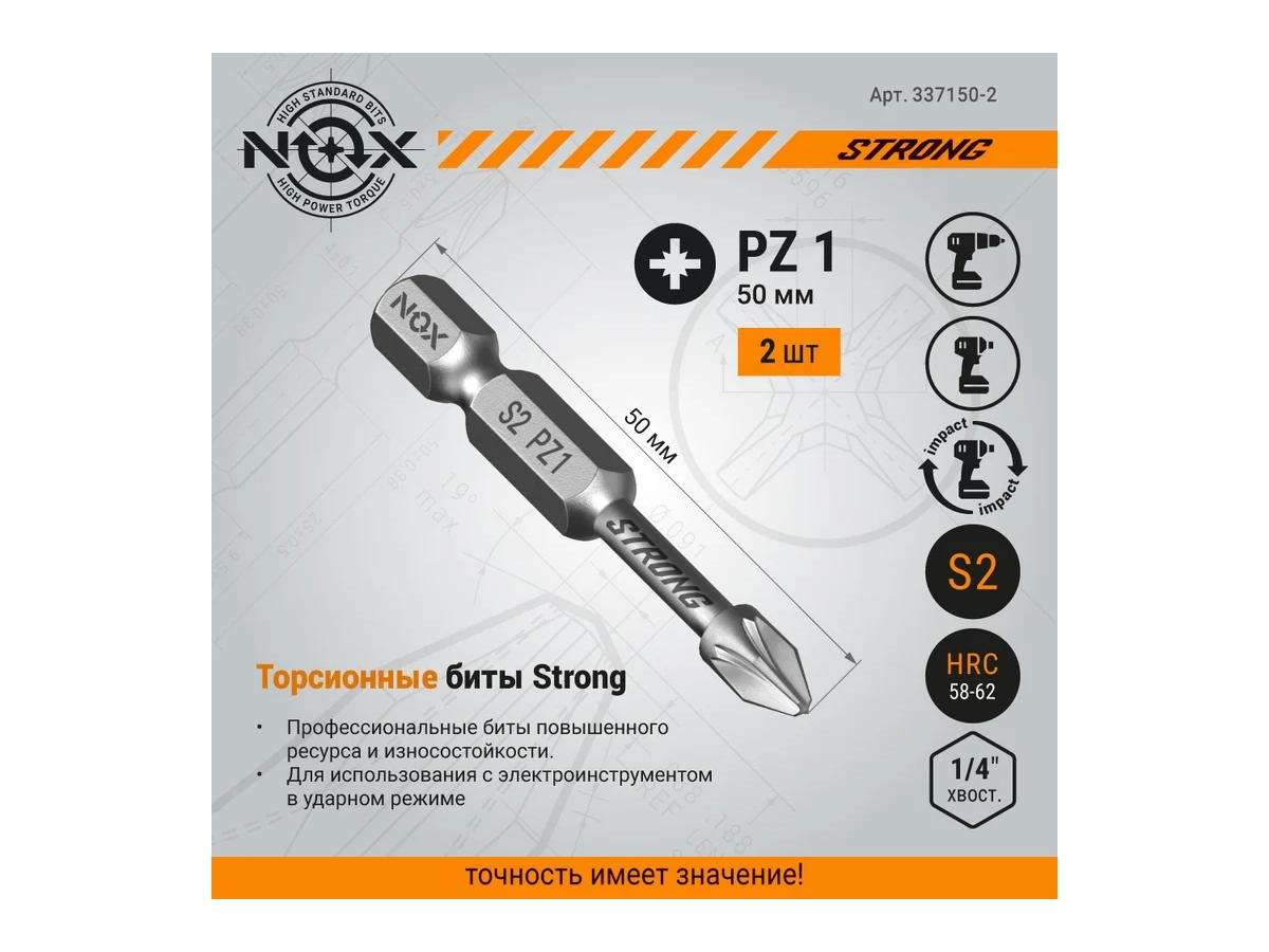 Торсионная бита NOX STRONG – профессиональная бита c повышенным ресурсом и износостойкостью. Предназначена для использования с электроинструментом в ударном режиме.