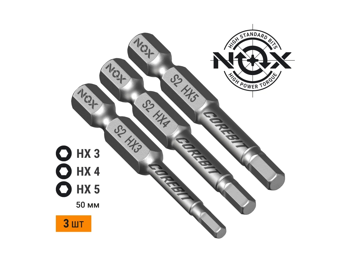 В набор входит 3 биты с популярными шлицами HX3, HX4, HX5, длина 50 мм.