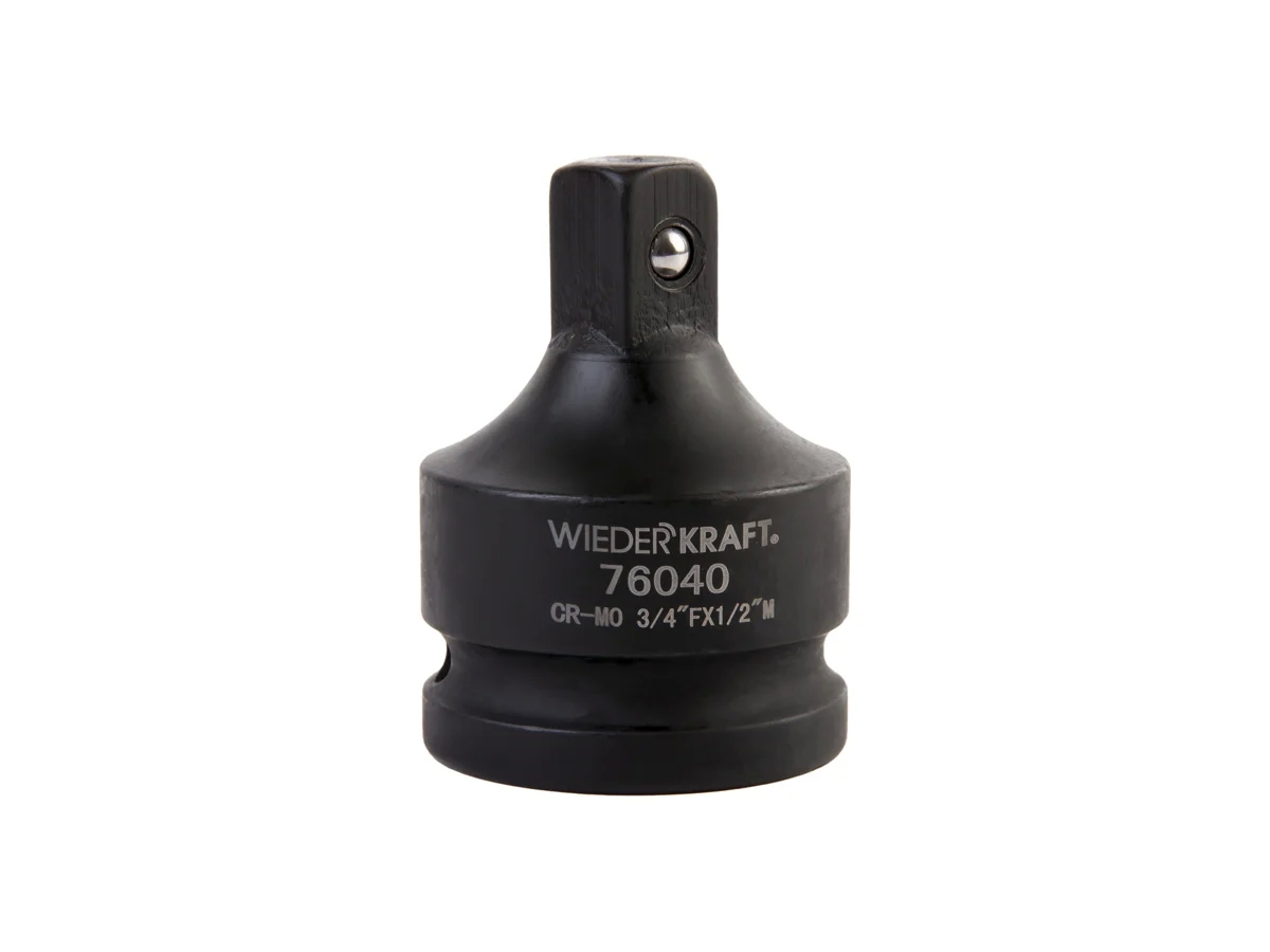 Переходник для ударных торцевых головок WiederKraft WDK-76040 с приводами F3/4? (мама) и M1/2? (папа). Выполнен из высококачественной хром-молибденовой стали 42 CrMo. Адаптер имеет рабочую длину 100 мм. Включения хрома и молибдена делают изделие прочным, устойчивым к нагрузкам и деформациям.