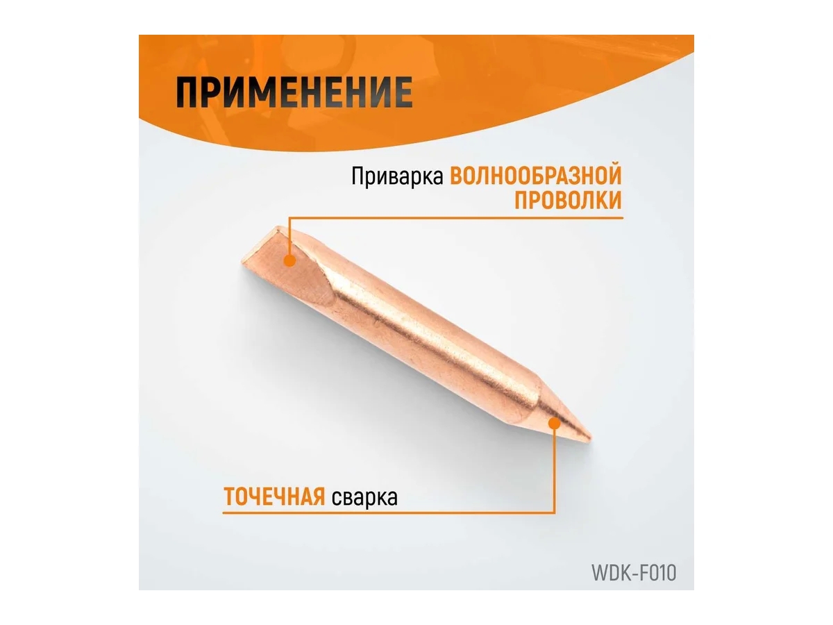 Электрод для точечной приварки волнообразной проволоки WIEDERKRAFT WDK-F010 — сменный элемент для споттера, предназначенный для надежного соединения проволоки с кузовной поверхностью при рихтовке металла. Обеспечивает точную передачу сварочного тока, стабильный контакт и равномерный прогрев зоны сварки.