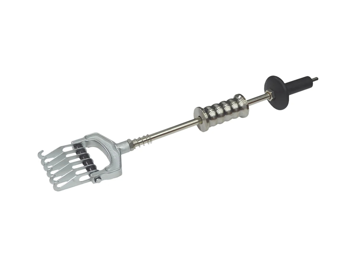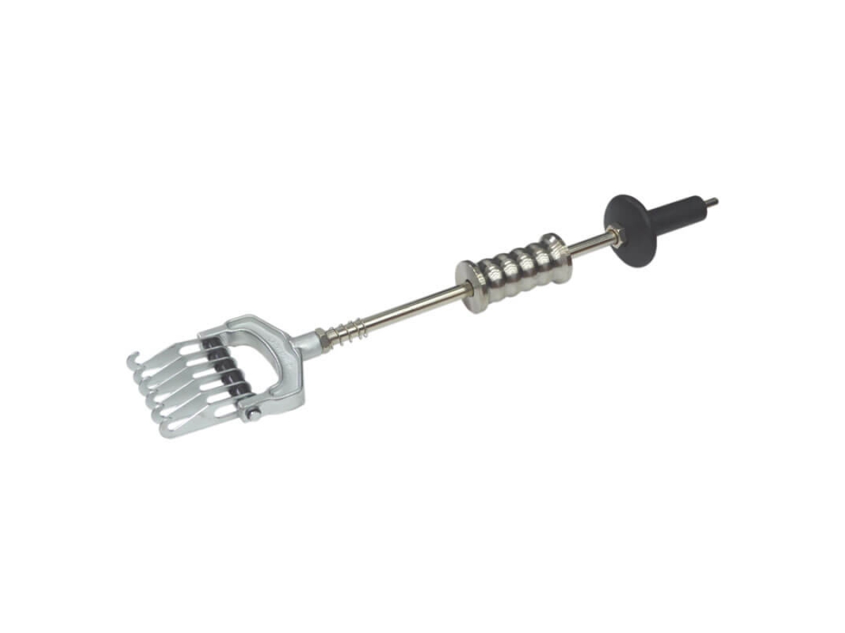 Универсальный обратный молоток с захватом с 6-ю крюками WIEDERKRAFT F014/4 предназначен для вытягивания вмятины на кузове. Инструмент используется в автомастерских или в гараже. Корпус из прочной стали обеспечивает длительность службы. На конце расположен захват с шестью крюками.