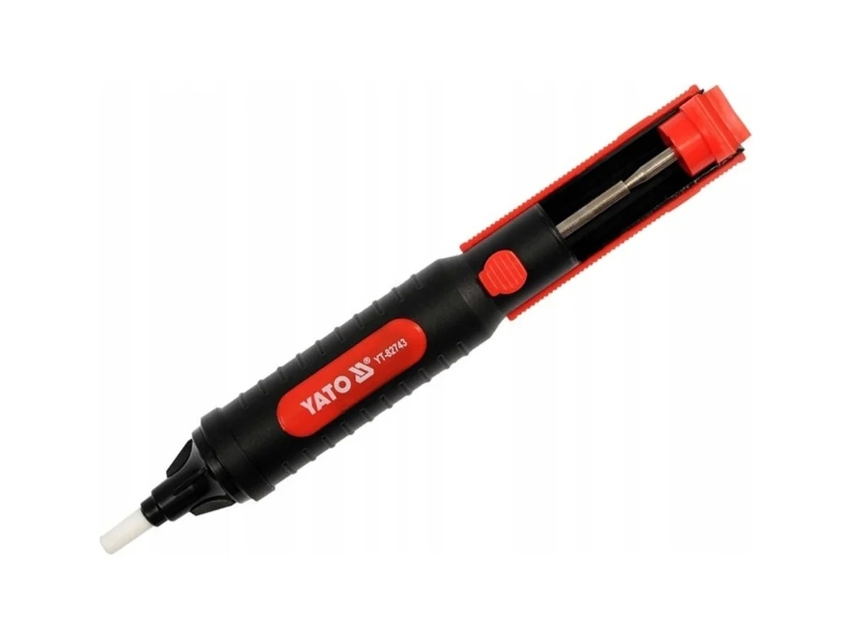 Шприц YATO YT-82743 служит для отсоса излишков олова при пайке или распайке. Изготовлен из пластика. Отличается высокой мощностью всасывания и тихой работой.