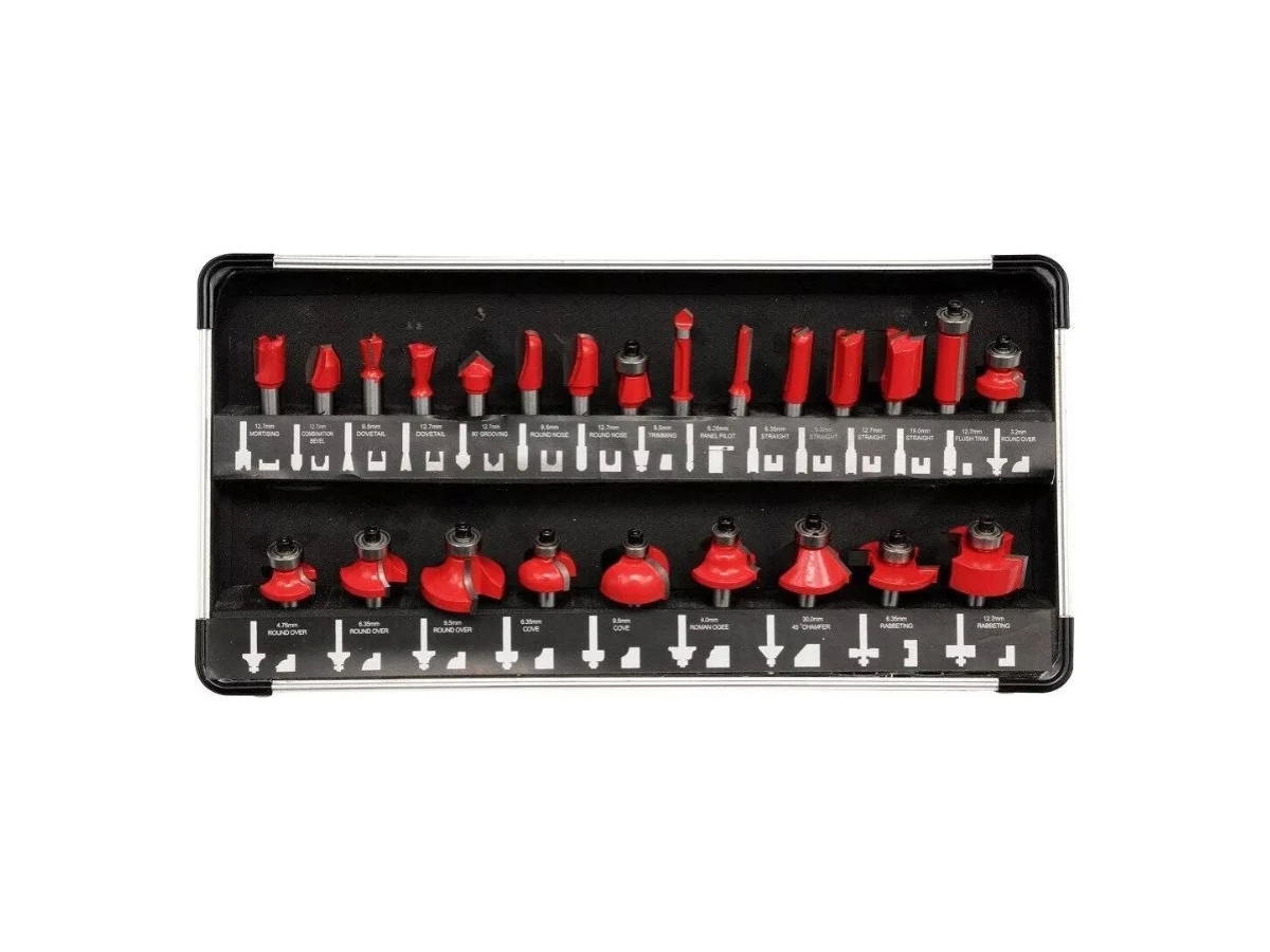Набор фрез по дереву YT-6801. Стержень диаметром 8 мм, головки с профилированными режущими пластинами из карбида кремния YG6X. Серебристая пайка, допуск на размеры 0,08 мм. Фрезы имеют кромки и подшипники для облегчения управления фрезерным станком.