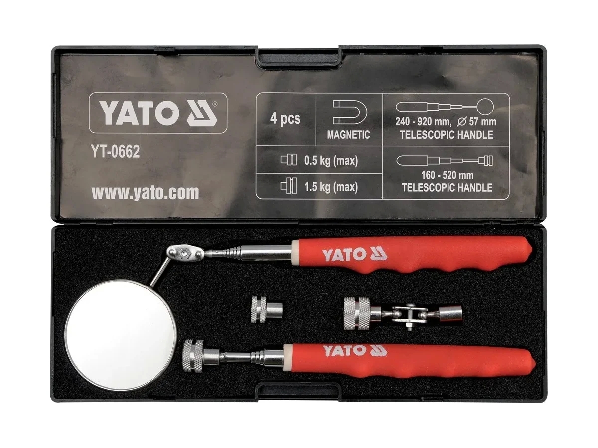 Проверочный набор YATO держатель и зеркало YT-0662 используется в профессиональных мастерских и сервисах различных отраслей.