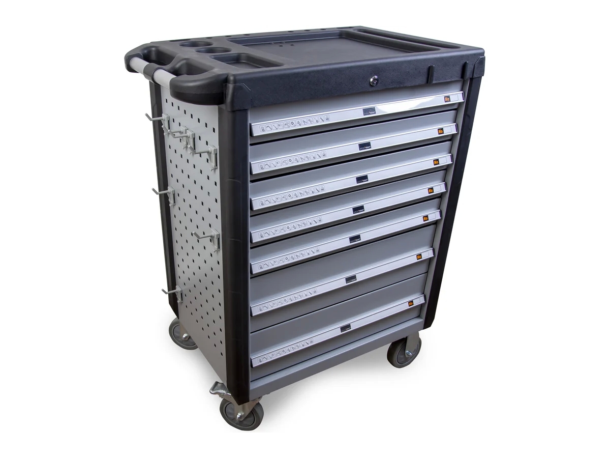 Тележка выполнена из стали толщиной 1,0–1,5 мм, что обеспечивает высокую прочность и устойчивость к износу. Оснащена механическим центральным замком. Наличие защиты от опрокидывания обеспечивает надежное перемещение и предотвращает открытие ящиков тележки. Боковые перфорированные панели позволяют размещать дополнительные держатели и аксессуары.