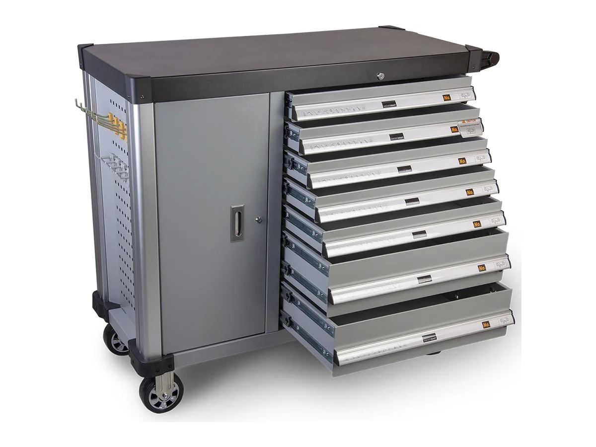 Все ящики оснащены роликовыми направляющими с подшипниками, что делает их выдвижение легким и плавным даже при полной загрузке. Усиленный металлический корпус выполнен из металла толщиной 2,0 мм, что гарантирует долгий срок службы. Центральный замок и система защиты от опрокидывания обеспечивают безопасность при перемещении тележки.