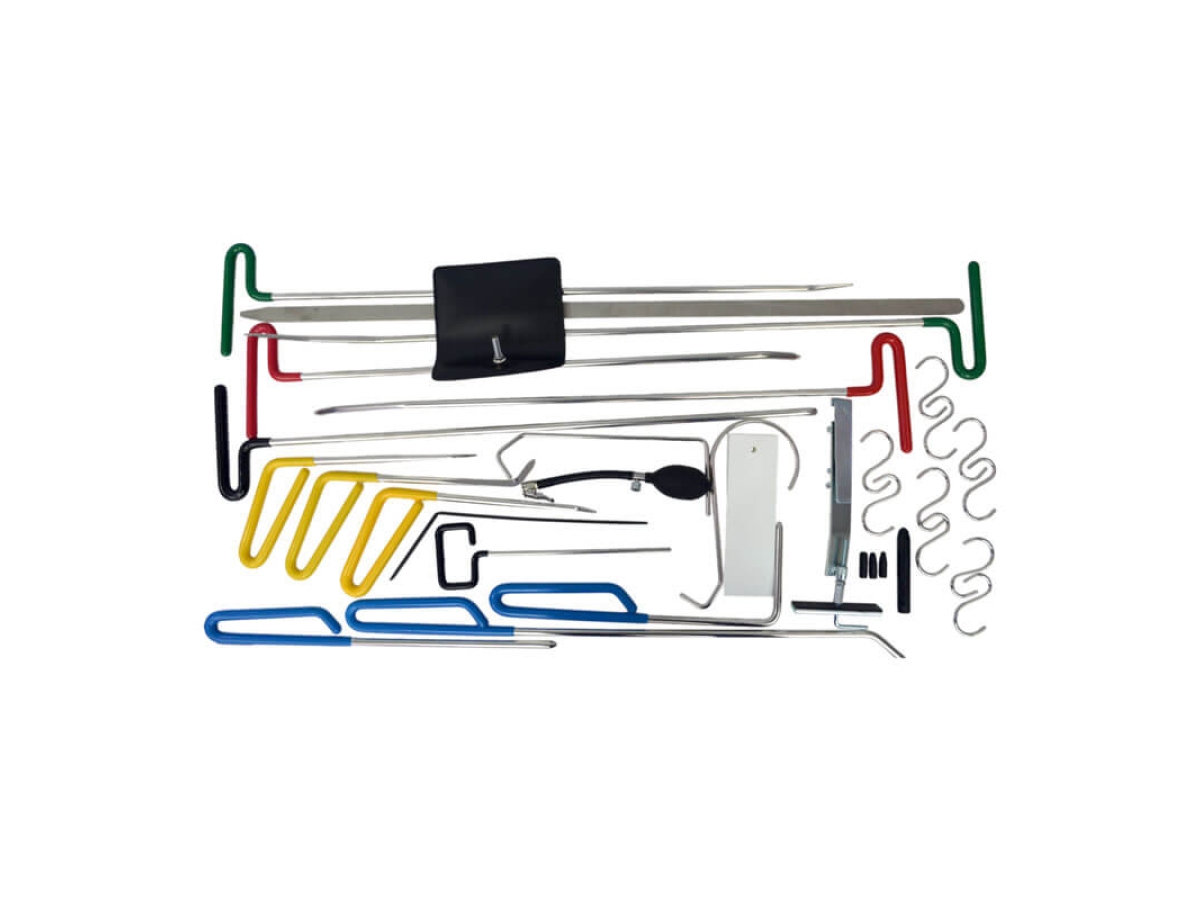 Набор для устранения вмятин без покраски WIEDERKRAFT WDK-65214 служит для ремонта автомобиля. Данный комплект инструментов используется только в том случае, если произошло искривление кузова без повреждения лакокрасочного покрытия. Воздействие на кузов происходит плавно с внутренней или внешней стороны кузова, преимущественно крюками.