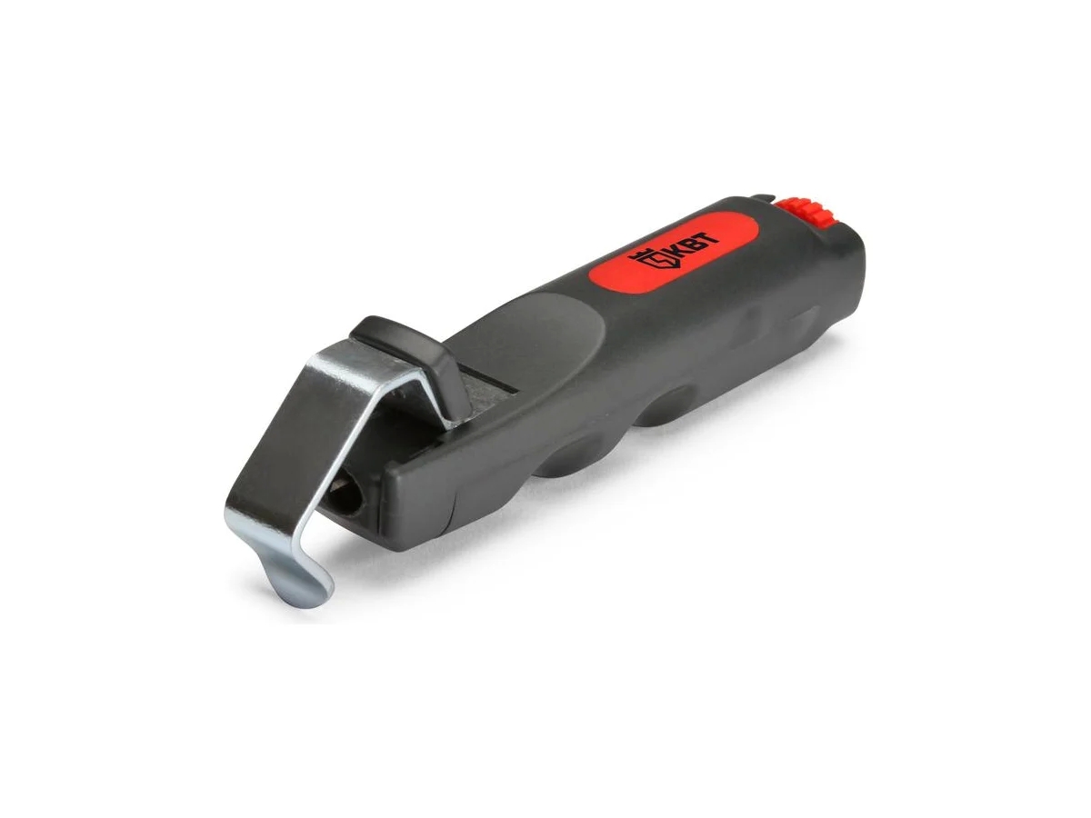 Инструмент для снятия изоляции КВТ КС-28у 70438 аккуратно делает надрезы на кабеле и снимает слой оболочки без повреждения металлических жил. Представляет собой компактное устройство в виде эргономичной рукоятки с прижимной скобой, которая фиксирует провод в рабочей зоне. С помощью автоматически поворачивающегося ножа и регулировки глубины реза можно осуществлять как продольные, так и поперечные разрезы защитных оболочек кабеля.