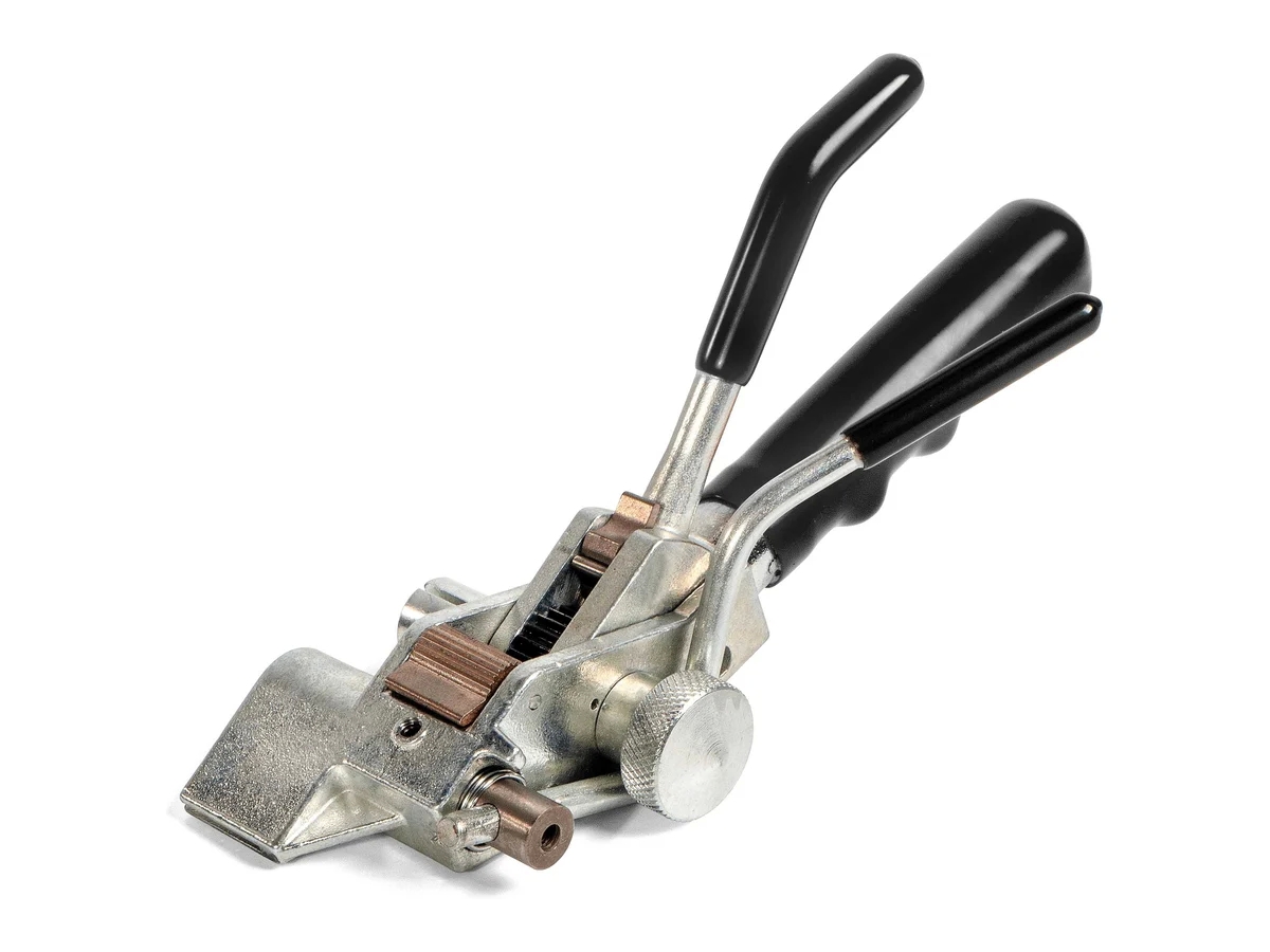 Инструмент для натяжения ленты КВТ ИНТу 20 74030 оснащен храповым механизмом, который обеспечивает максимально качественную затяжку ленты, а также позволяет обрезать лишнее. Для этого инструмент комплектуется дополнительным ножом, который срабатывает при финальном отпускании рукоятки. Основной материал ленты - нержавеющая сталь.