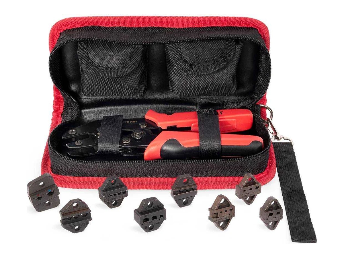 - Универсальный инструмент с максимальным количеством сменных матриц для опрессовки широкого ряда неизолированных разъемов и наконечников (автоклемм), втулочных наконечников, изолированных наконечников и разъемов, неизолированных трубчатых наконечников и гильз