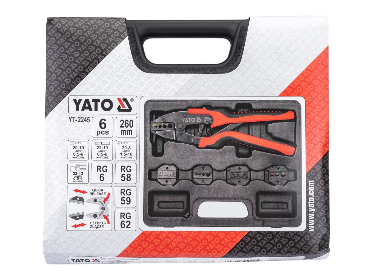 Пассатижи для обжима и зачистки проводов в наборе YATO 6 предметов (пластиковый кейс) YT-2245 представляет собой профессиональный кримпер (пресс-клещи) в наборе с 5-ю сменными матрицами для обжима наиболее распространенных кабельных наконечников многожильных проводов электрических и высокочастотных кабелей при производстве электромонтажных работ.