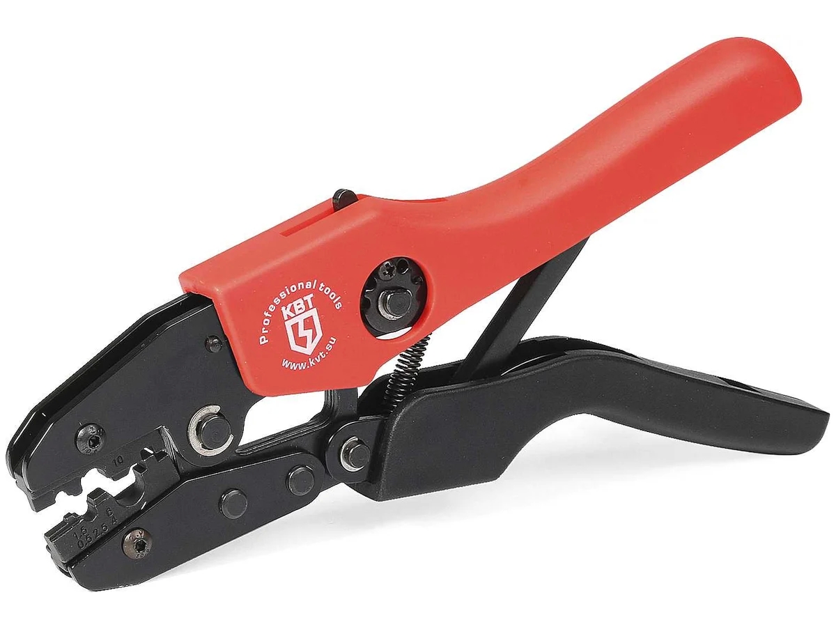 Пресс-клещи КВТ CTK-05 56542 предназначены для работы с медными наконечниками и гильзами ТМЛ, ТМЛс, ТМ, ГМЛ, ГМЛ(о) и наборами СОТК в диапазоне сечений 0.25-10 мм2. Инструмент отличается простотой в эксплуатации, храповый механизм обеспечивает полный цикл опрессовки. Усиленная конструкция с надежной механикой рассчитана на длительное использование.