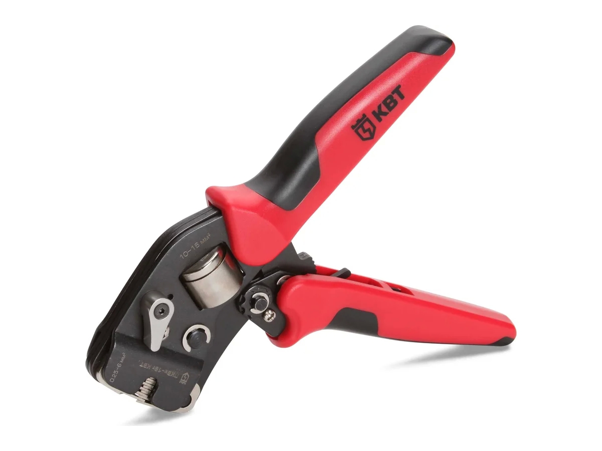 Торцевые пресс-клещи КВТ ПКВк-16т 74595 оснащены универсальной матрицей, которая позволяет работать с несколькими размерами наконечников. Инструмент легко регулируется под конкретный диаметр, имеется переключатель прижимного усилия матрицы. Удобные рукоятки с упорами обеспечивают достаточную передачу усилия. Храповый механизм используется для равномерной опрессовки от начала и до конца операции. Преимущество инструмента заключается в небольшой длине и оптимальном наклоне головки по отношению к рукояткам.