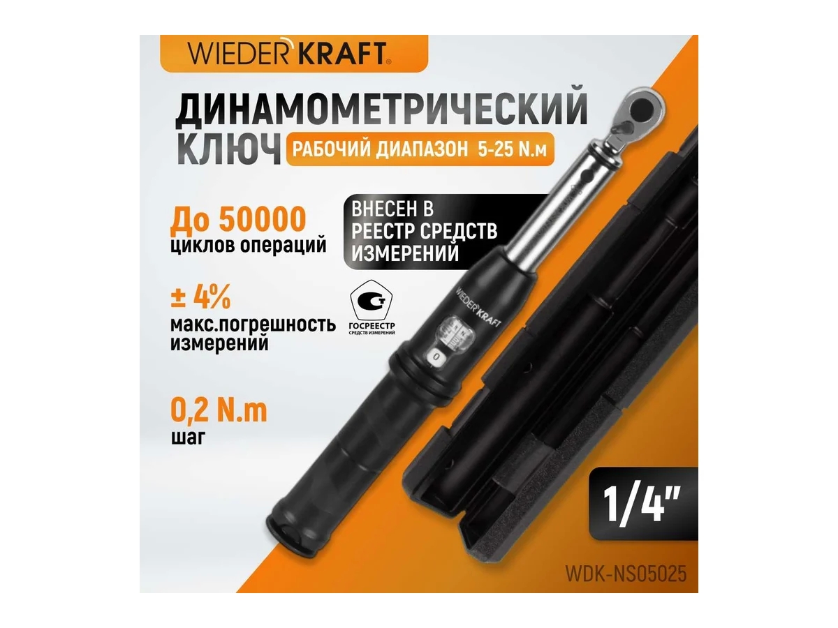 Динамометрический ключ WIEDERKRAFT 5-25 Нм, реверсивная трещотка с квадратом 1/4 WDK-NS05025 используетсядля работы в направлении часовой стрелки (CW).