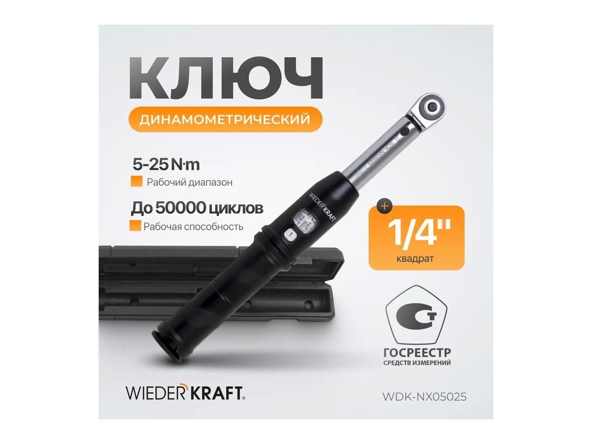 Динамометрический ключ WIEDERKRAFT 5-25 Нм, трещотка с проходным приводным квадратом 1/4 WDK-NX05025 используется для затяжки по часовой стрелке (CW) и против часовой стрелки (CCW).