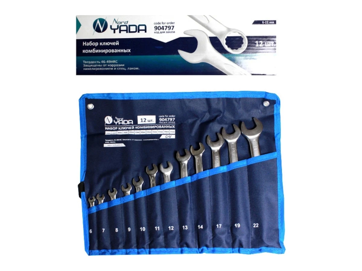 Набор комбинированных ключей Nord-Yada 12 предметов: 6-14,17,19,22 мм планшет TM Nord YADA 904797 предназначен для работ с крепежом. Может использоваться в бытовой и профессиональной сферах.