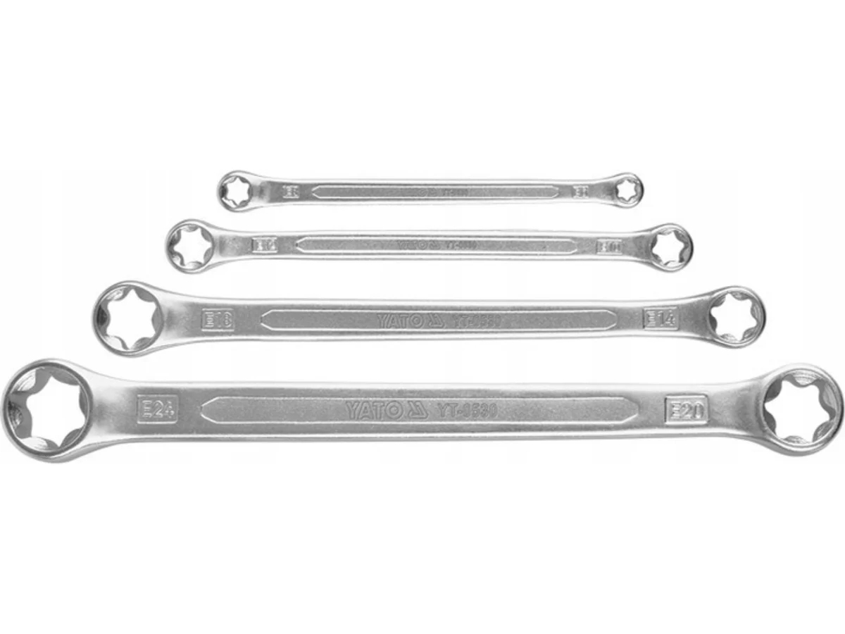 Набор накидных ключей YATO ТОRХ Е6-Е24 4шт. YT-0530 относится к инструментам профессионального класса. Изделия выполнены из нержавеющей хром-ванадиевой стали CrV 6150.