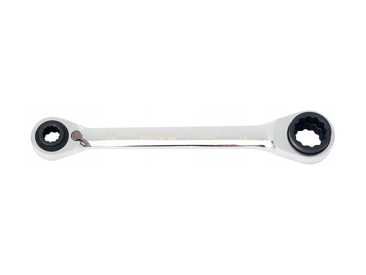 Двусторонний торцевой ключ с храповым механизмом изготовлен из прочной хромованадиевой стали. Благодаря двухсторонней конструкции ключа используются четыре размера: 10; 13; 17 и 19 мм. Трещотка имеет 72 зубца. Хромированная поверхность исключает возникновение коррозии. Ключ имеет переключатель для изменения направления вращения. Разработан для нужд специализированных автосервисов.