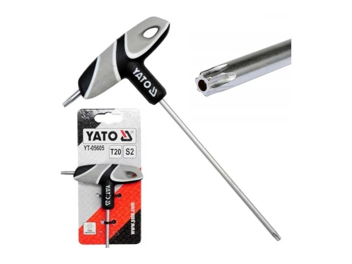 Ключ TORX с Т-образной рукояткой Т20 YATO YT-05605 изготовлен из прочной стали S2. Это позволяет работать с максимальной эффективностью. Конструкция имеет плечо 89 мм, что уменьшает усилие для вращения. Для удобства работы имеется двухкомпонентная рукоятка.