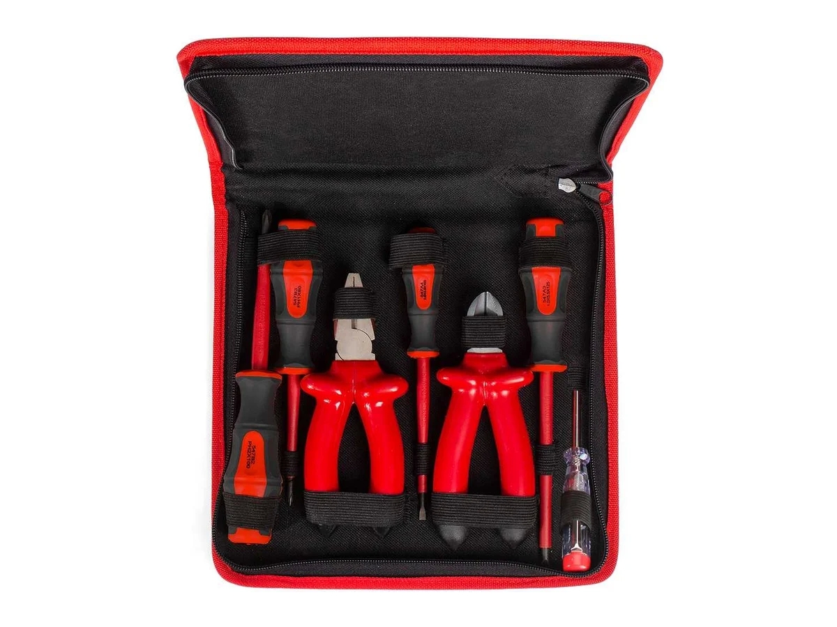 Набор изолированного инструмента КВТ НИИ-09 63995 предназначен для проведения электромонтажных работ. Все изделия способны выдержать напряжение до 1000 В. В рукоятках пассатижей и бокорезов есть упоры для исключения соскальзывания.