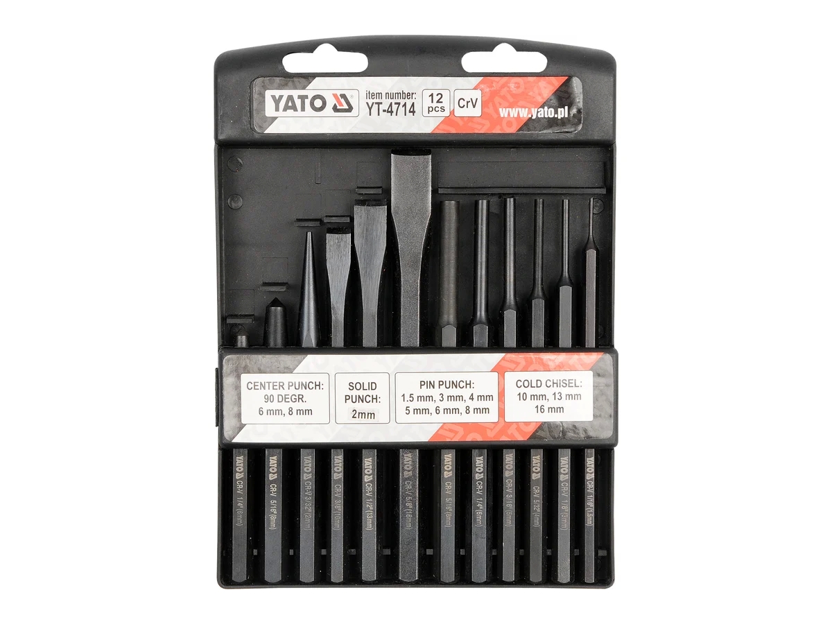 В комплект входят цилиндрические пуансоны 1,5, 3, 4, 5, 6, 8 мм, конусные пуансоны 2 мм, фрезы 10, 13, 16 мм, пуансоны 6 мм и 8 мм. Длина от 100 до 150 мм. Инструменты изготовлены из шестигранного стального прутка CrV 6150, поверхность чернена. Упаковывается в пластиковый контейнер.