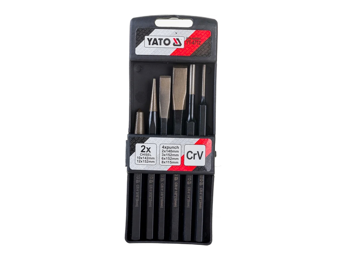 Набор зубил, пробойников и керн YATO 6пр YT-4712 изготовлен из стали CrV с шестигранным стержнем, поверхность черненая. Набор упакован в пластиковый контейнер.
