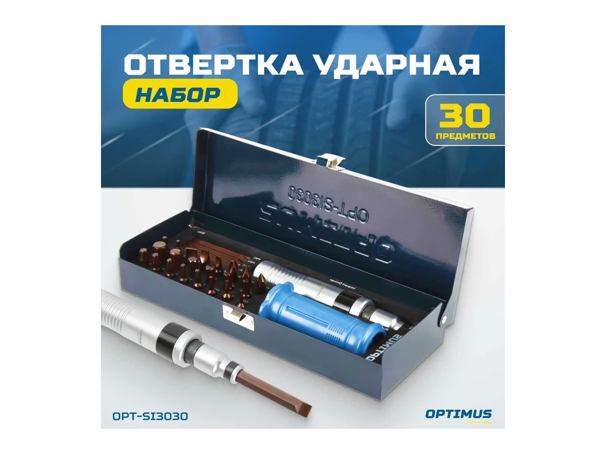 Ударная отвертка Optimus набор, 30 предметов OPT-SI3030 предназначена для откручивания туго завинченных резьбовых соединений. При ударе по бойку отвертки бита совершает проворот, обеспечивая эффективное откручивание или закручивание крепежа. Резиновый кожух предотвращает проскальзывание и защищает руки при работе. В комплекте ударные биты основных размеров и профилей из высокопрочной стали S2.