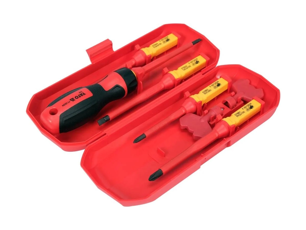 - Изолированная отвертка VDE в рукоятке + конфигурация с пятью сменными битами