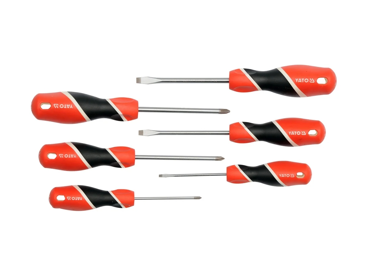 Набор отверток 6 предметов YATO YT-25965 укомплектован стержнями из стали S2. Сталь закалена до твердости 58 HRC. Это позволяет работать с крепежом без повреждения рабочей части отверток.
