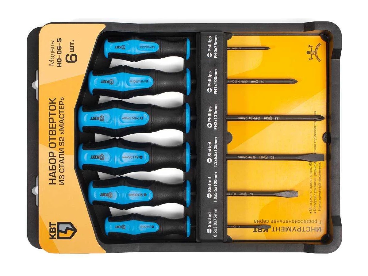 Набор отверток из стали S2 КВТ Мастер НО-06-S 78622 представляет собой набор качественных инструментов для монтажных и демонтажных работ. Все отвертки имеют намагниченные вороненые наконечники. Подходят для профессионального применения.
