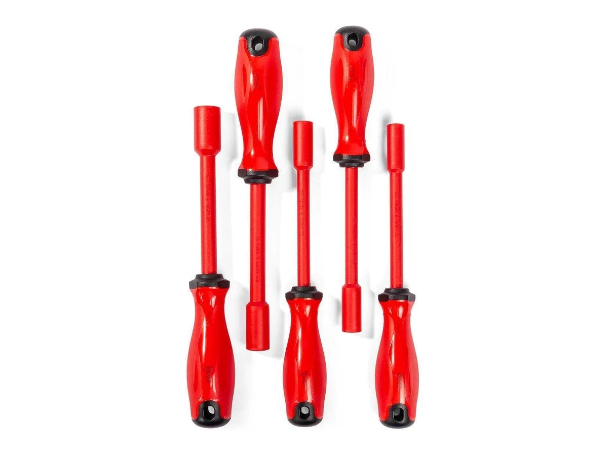 Набор торцевых диэлектрических отверток предназначен для работы по монтажу и демонтажу гаек и болтов с шестигранной головкой под напряжением до 1000 В. Инструменты выполнены из хромомолибденовой стали, что делает их надежными и долговечными. Двухкомпонентные нескользящие рукоятки с защитой от скатывания обеспечивают комфортное использование.