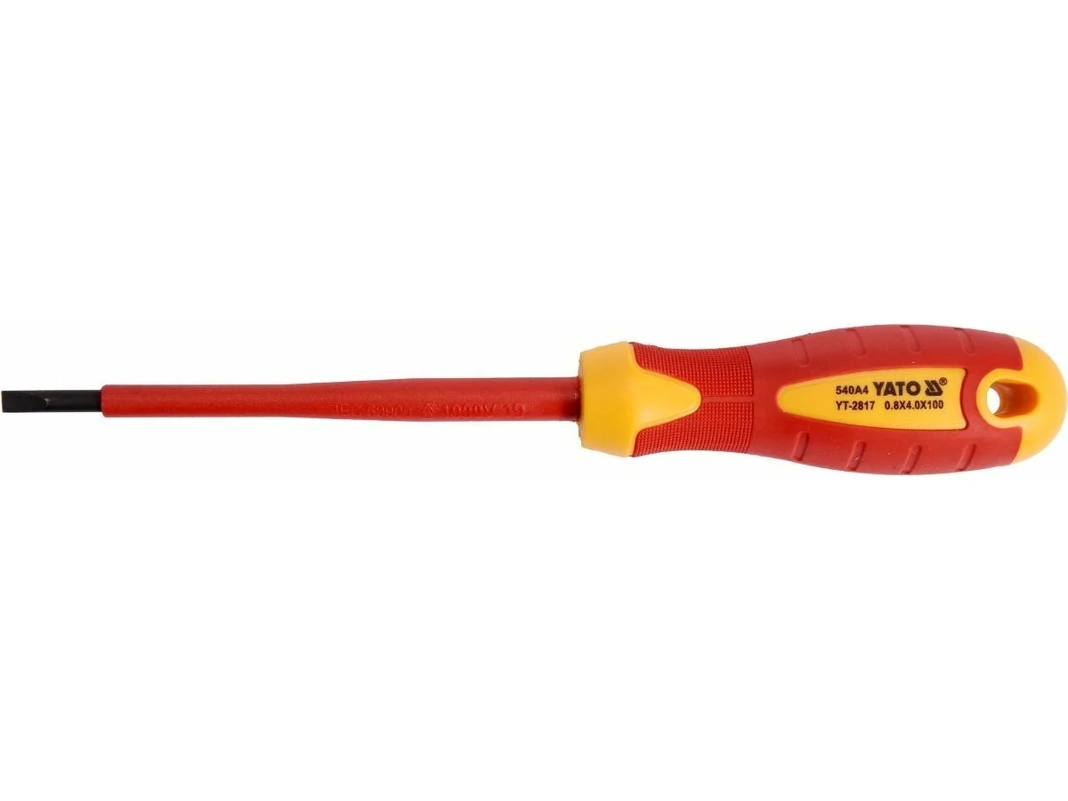 Диэлектрическая отвертка YATO 1000 В 4x100 мм YT-2817 применяется при работах с резьбовыми соединениями, находящимися под электрическим напряжением. Инструмент выполнен из качественной и прочной стали, благодаря чему отличается надежностью и долговечностью. Эргономичная рукоять снижает усталость рук при длительной работе. Подходит для бытового и профессионального использования.