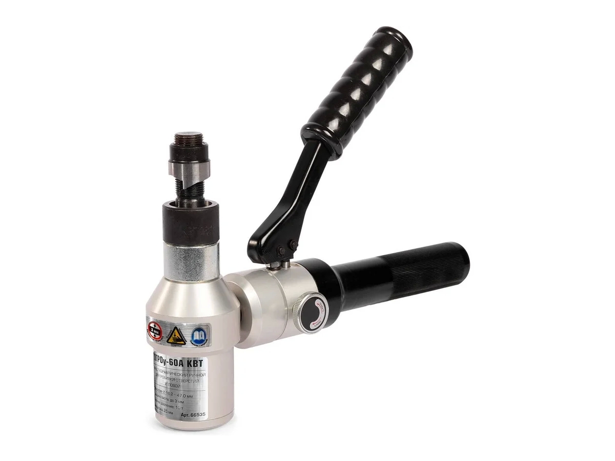 Гидравлический ручной угловой пресс для пробивки отверстий КВТ ПГРОу-60А 66535 оснащается рабочей головой с функцией поворота на 360 градусов. В качестве оснастки используются перфоформы (матрица+пуансон) 8 вариантов размера, которые позволяют пробивать отверстия диаметром 16.2, 18.6, 20.5, 22.5, 25.4, 28.3, 37 или 47 мм. Корпус агрегата выполнен из жесткого и прочного материала - алюминиевого сплава.