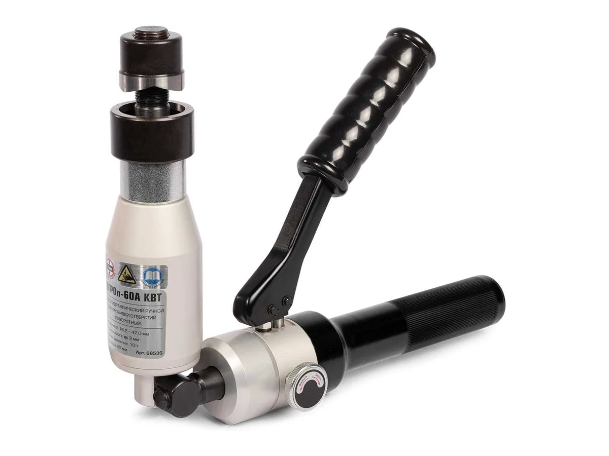 Поворотный гидравлический ручной пресс для пробивки отверстий КВТ ПГРОп-60А 66536 служит для изготовления отверстий диаметром 16.2 мм, 18.6 мм, 20.5 мм, 22.5 мм, 25.4 мм, 28.3 мм, 37 мм и 47 мм. В качестве рабочей жидкости используется гидравлическое масло объемом 70 мл. Алюминиевый сплав обеспечивает корпусу модели необходимую жесткость и легкость. Максимальная толщина пробиваемого стального листа (St 37) составляет 3 мм.