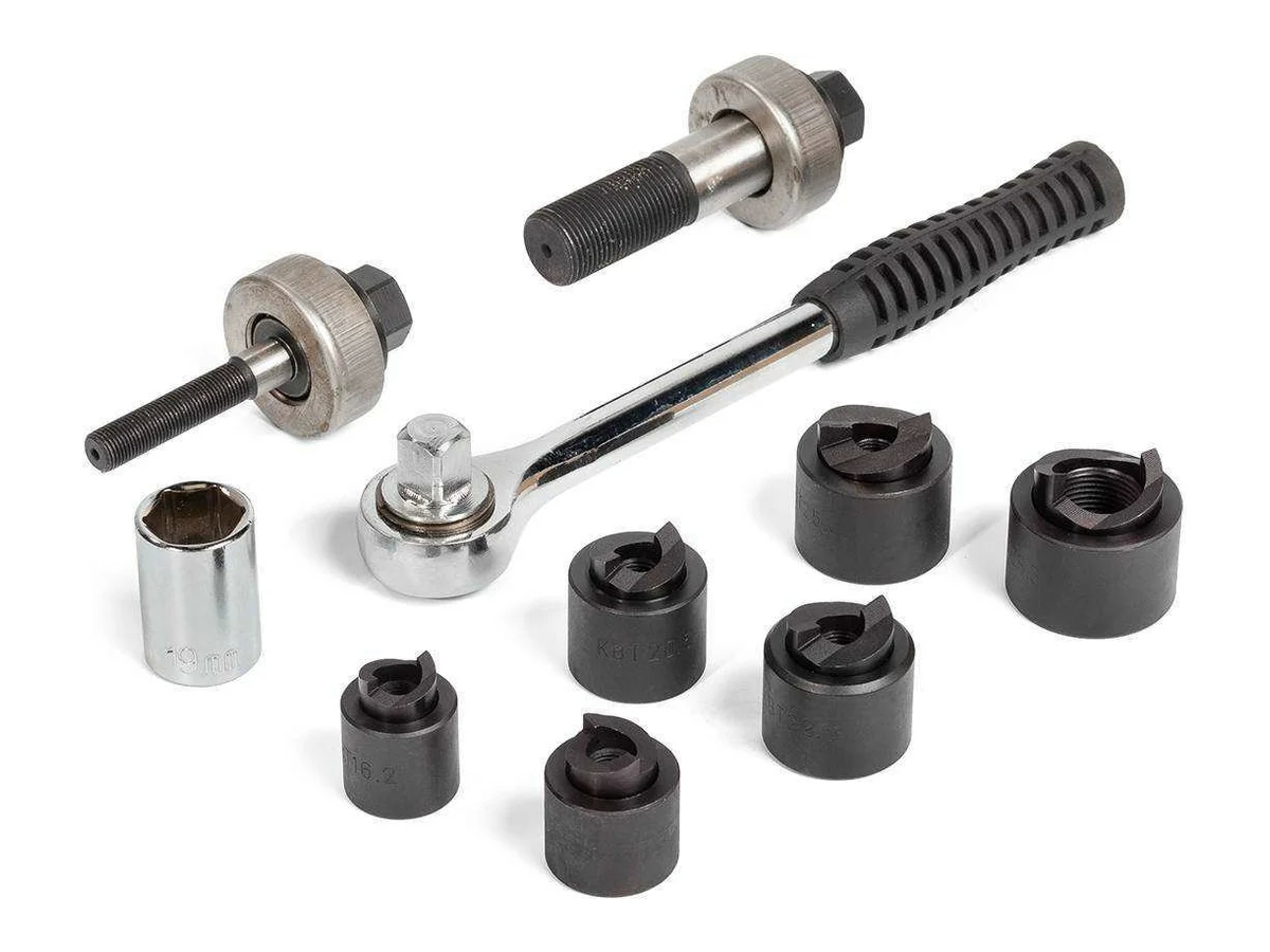 Ручной пресс для пробивки отверстий КВТ ПРПО-60 85440 представляет собой инструмент для пробивки отверстий в металлических листах при монтаже сборочных шкафов, щитков под кабельные вводы, приборы, кнопки, замки. Каждая перфоформа представлена парой матрица – пуансон специальной конструкции, которая позволяет разрезать кольцевой отход на две части во избежание застревания высечки внутри перфоформы.