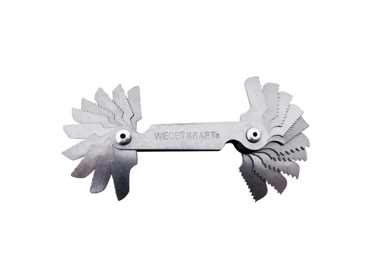 Резьбовой шаблон WIEDERKRAFT резьбомер, шагомер, 60 град и 55 град WDK-MG5560 предназначен для определения номинального шага (ниток на дюйм) дюймовой резьбы (55°) и метрической резьбы (60°).
