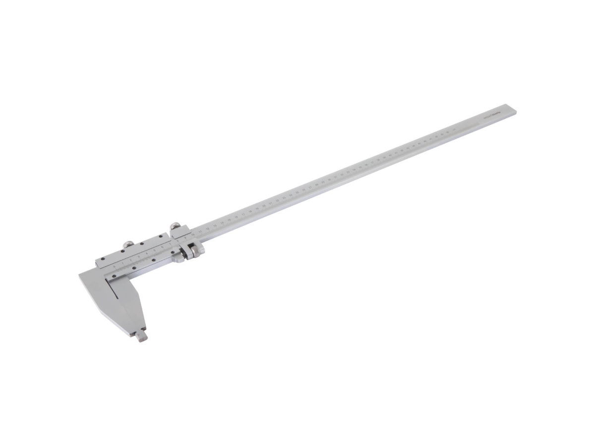 Рамка нониуса перемещается плавно, с возможностью точной настройки за счет микроподачи. Упор с насечками под большой палец делает перемещение рамки более контролируемым. Фиксирующий винт удерживает измерения в нужном положении. Обе шкалы — основная и нониусная — имеют матовое покрытие для удобного считывания.