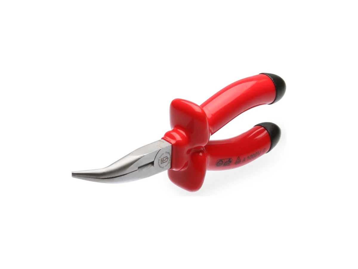 Диэлектрические длинногубцы КВТ изогнутые Эксперт 200 87101 используются для работ под напряжением до 1000 В. Рукоятки выполнены из двухслойной диэлектрической пластизоли: внутренняя изоляция –желтого цвета, внешний слой изоляции – красного цвета. Захватные губки с зубцами и режущими кромками предназначены для резки среднетвердой и твердой проволоки. Режущие кромки дополнительно закалены токами высокой частоты до твердости HRC 62. Рабочая часть выполнена из качественной хромованадиевой стали, что обеспечивает прочность и долговечность. Матовое никелирование защищает инструмент от коррозии. Дополнительно закаленные режущие кромки. Изогнутые губки.