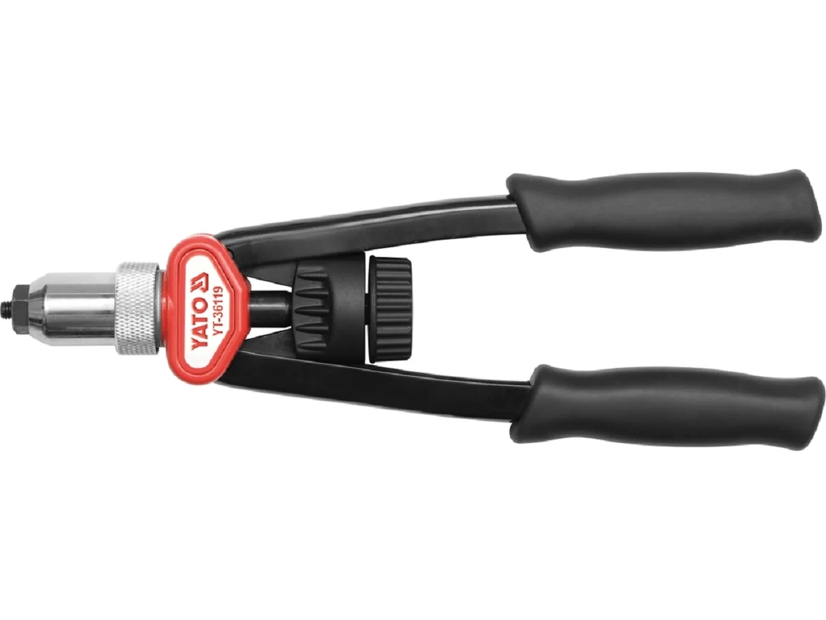 Заклепочник для резьбовых заклепок YATO М5-М12 YT-36119 предназначен для соединения материалов с помощью заклепочных гаек. Данная модель имеет ручки из углеродистой стали, корпус из алюминия (ADC12), рабочая головка и тяговый штифт из хромистой стали (40Cr).