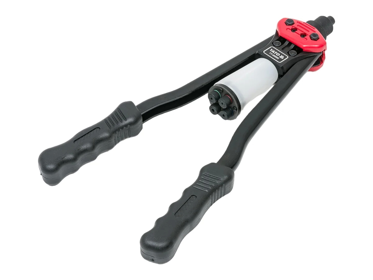 Двуручный заклепочник 2,4 - 6,4мм YATO YT-36095 имеет длину 380 мм. Этого достаточно для приложения оптимальных усилий. Конструкция предоставляет возможность для работы с заклепками пяти различных размеров. Преимущество изделия заключается в удобных накладках и рычажной системе.