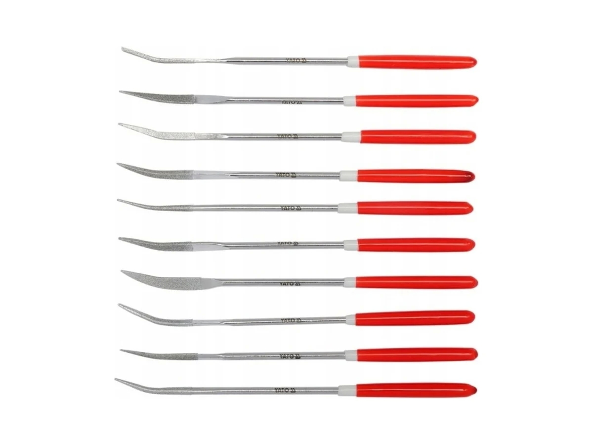 Алмазные надфили YATO в наборе 3x140x30мм 10 предметов YT-6146включает в себя инструмент, которыйимеет перекрестную насечку. Она позволяет работать с изделиями под любым углом.