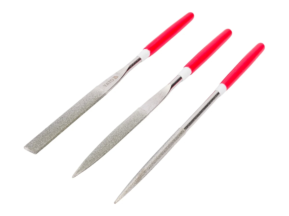 Алмазные надфили в наборе YATO 5x180x70мм, 3пр YT-6155 предназначены для выполнения мелких слесарных работ с заготовками из особо твердых материалов, таких как: металлы, керамическая плитка, стекло и пр. Инструменты очень удобны в применении, так как оснащены пластиковыми ручками. Надфили изготовлены из высокоуглеродистой стали и имеют напыление из алмазной крошки. В набор вошли 3 надфиля следующих типов: плоский, круглый, овальный.