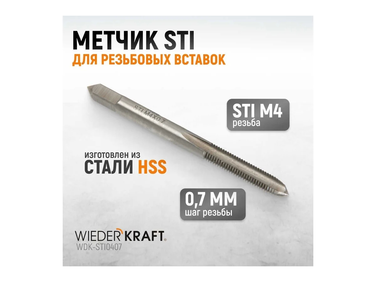 Метчик WIEDERKRAFT STI M4x0,7 HSS WDK-STI0407 предназначен для совместного применения с резьбовыми вставками при восстановлении метрической резьбы.